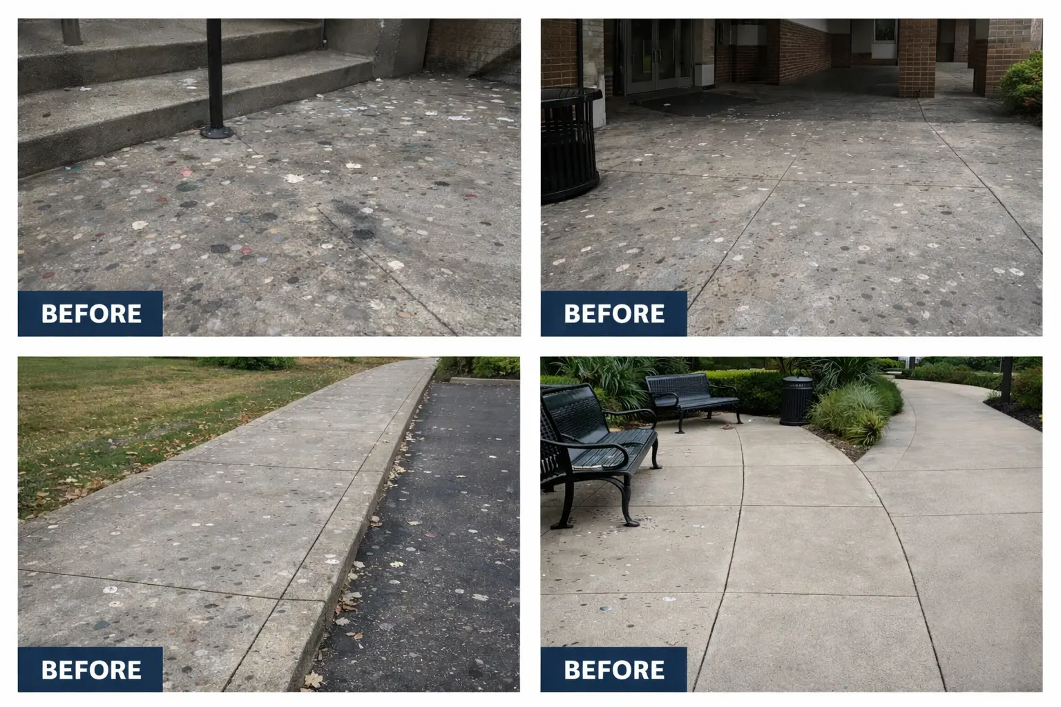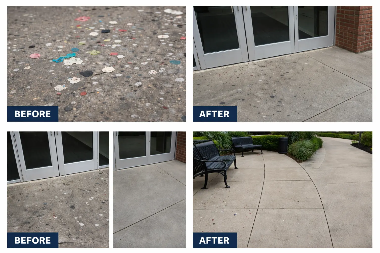 Real results from sidewalks, entryways, and walkways with visible gum buildup, restored to a cleaner, more uniform finish.